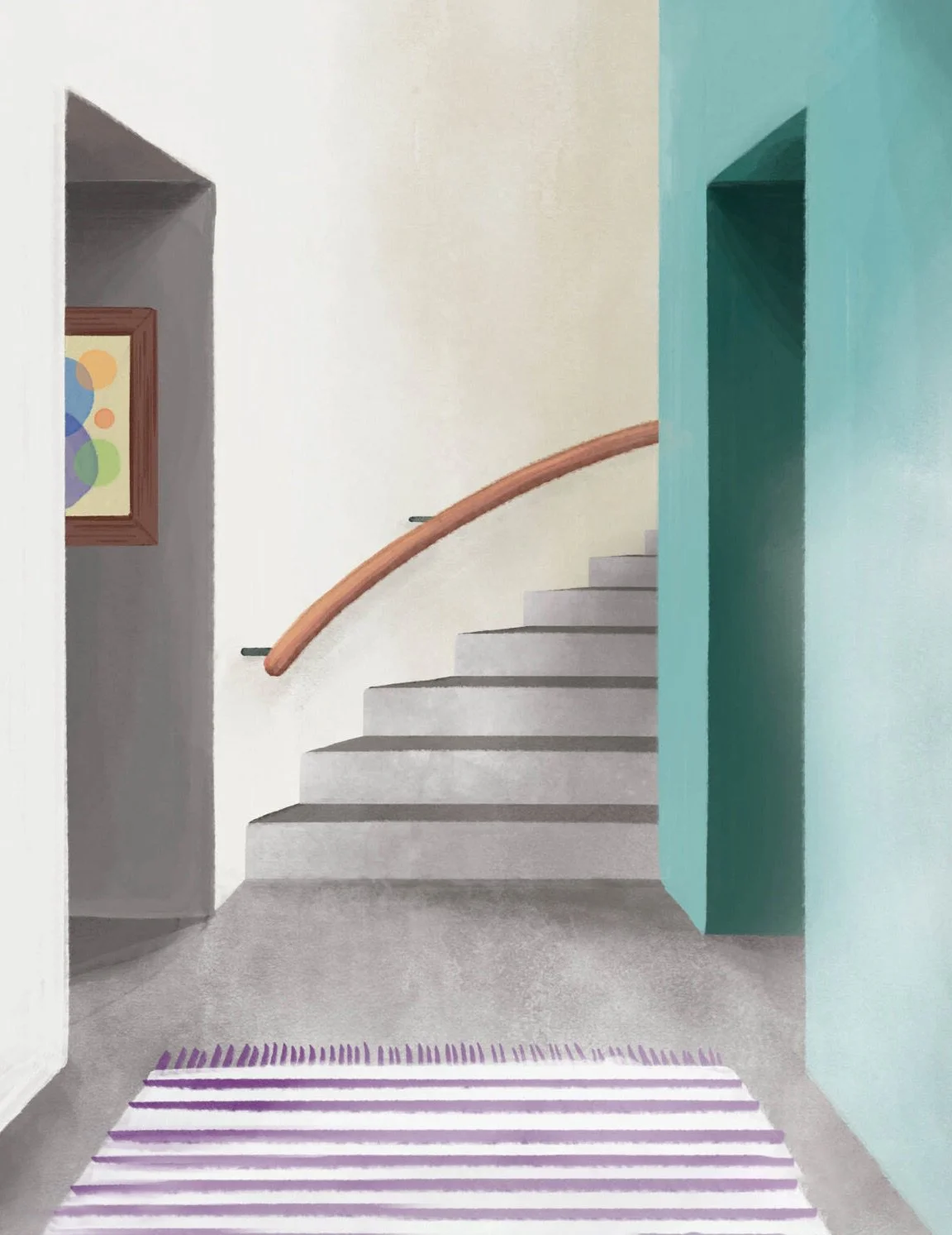 The paper illustrations were used as a base layer in Adobe Photoshop for digital painting, building up layers of color, texture, and detail. I edited or removed details to the layouts as needed for future text integration. Using a limited color palette and brush library helped speed the digital painting process along and stay within the project timeline.